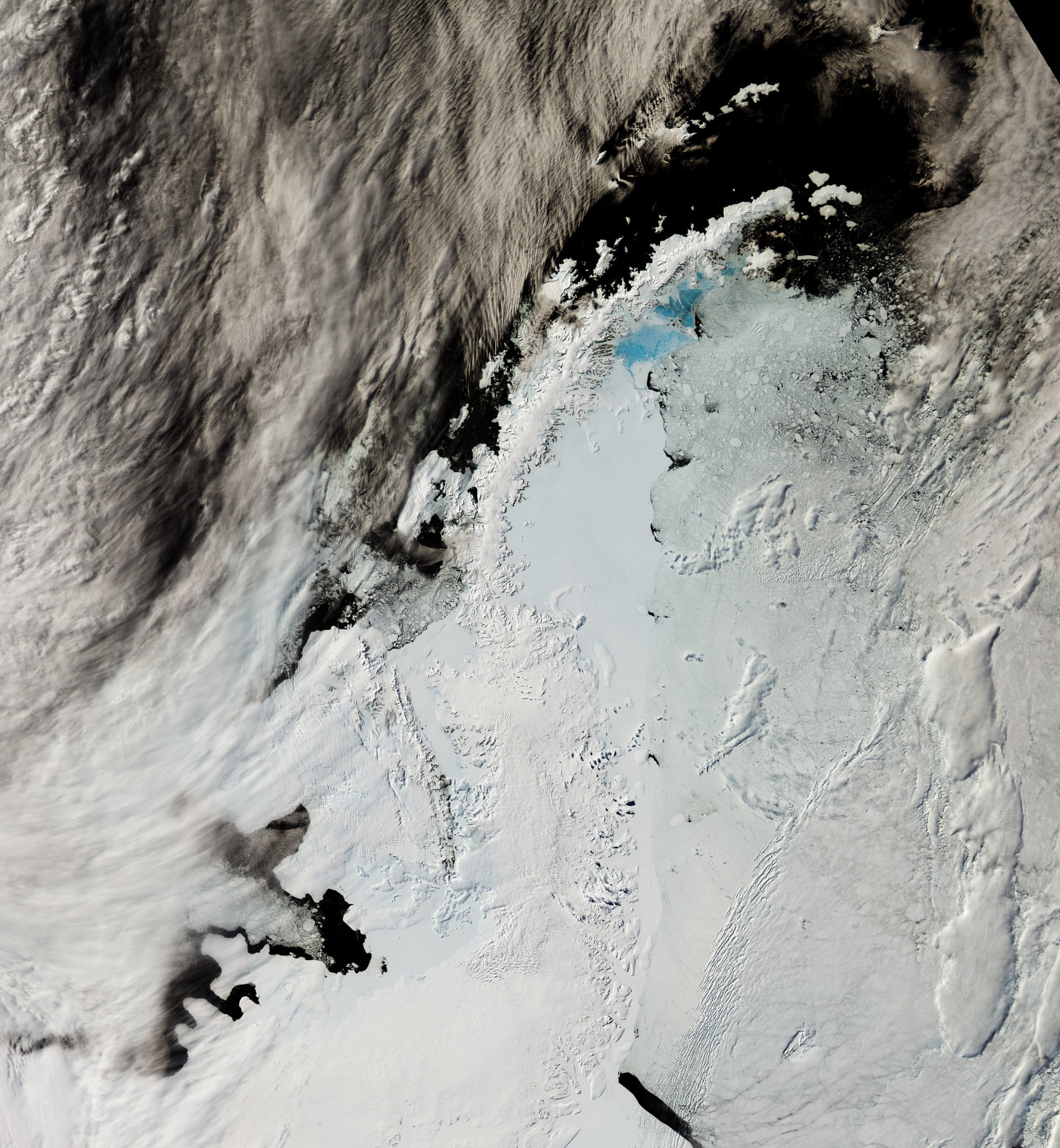 Ma di tanto in tanto, di solito a gennaio o febbraio, ci può essere una pausa tra le nuvole per ottenere una buona visione dal satellite della Nasa. La penisola montuosa coperta di ghiacci si estende per 1.300 km nell'Oceano meridionale. Alcuni geologi pensano che milioni di anni fa, le montagne potevano essere collegate alle Ande.Come con la maggior parte dell'Antartide, la caratteristica che domina la penisola e l'oceano che lo circonda è il ghiaccio. C'è ghiaccio sulla terra: i ghiacciai e calotte di ghiaccio.